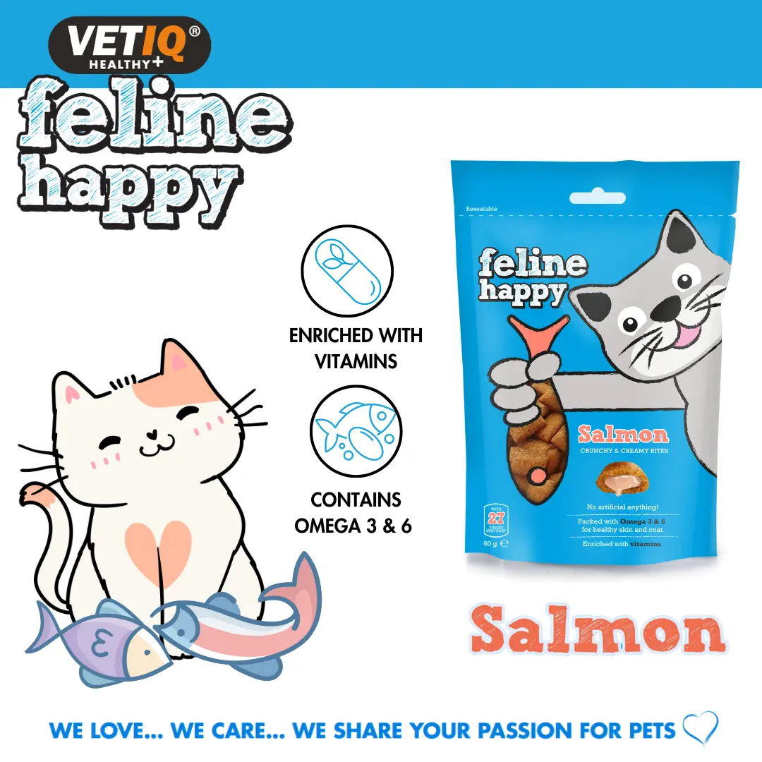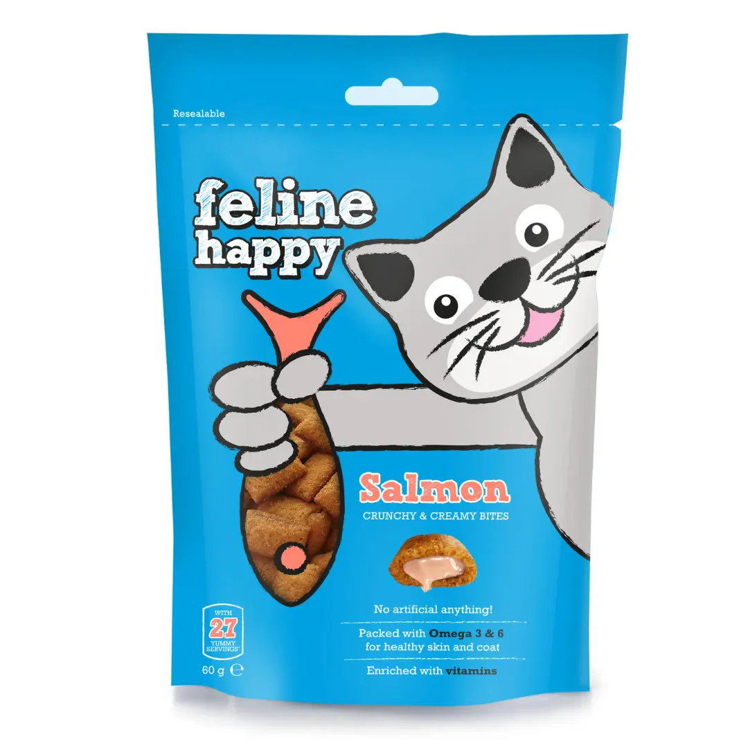 Feline Happy Salmon Cat Treats are gourmet treats made with wholesome ingredients. Not only are they absolutely scrumptious but they’re healthy too, with no artificial anything! Each bite has a crispy shell and soft creamy centre that are irresistible.