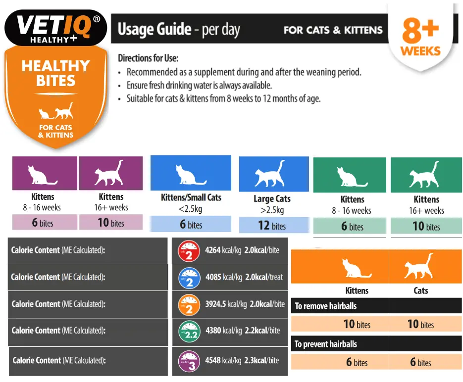 - 1 x Healthy Bites Hairball Relief – Help the natural passage of swallowed hair through the gut to prevent hairball formation. They contain no artificial colours, flavors, or preservatives and are wheat-free.