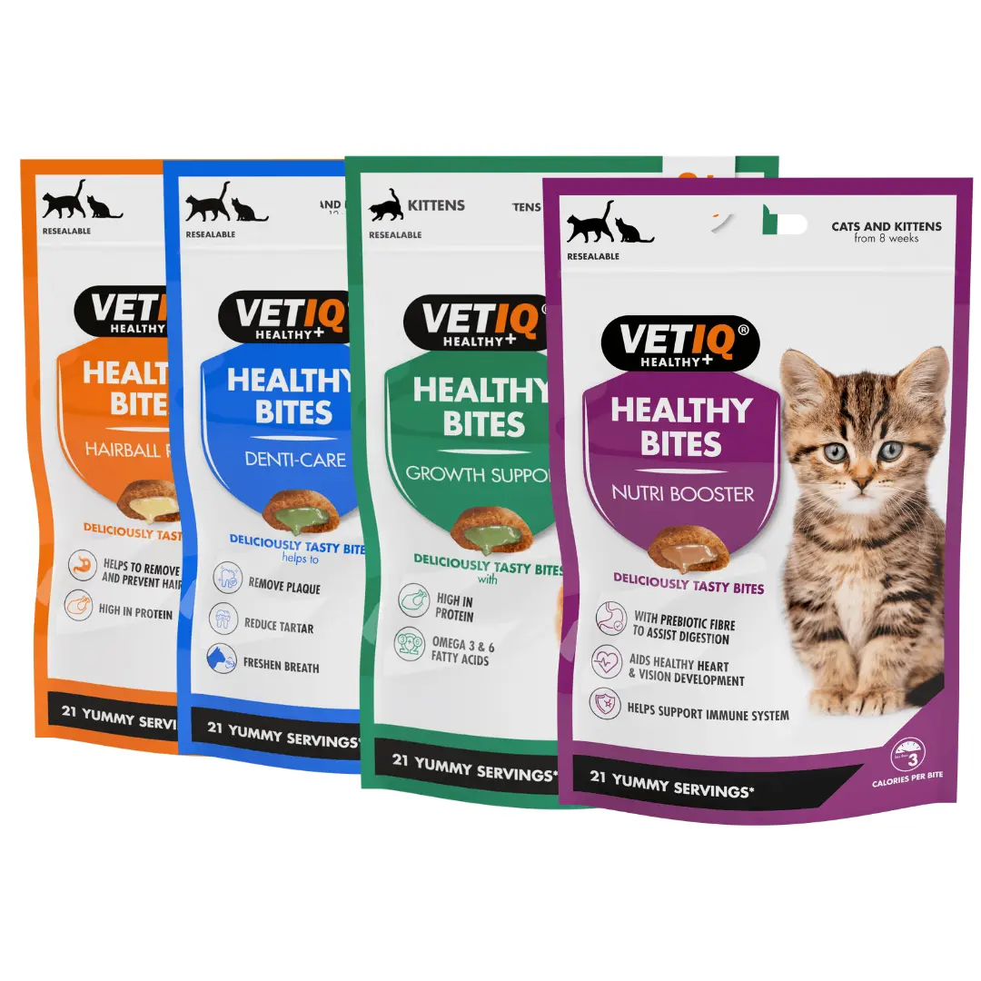 Healthy Bites make caring for your kitten both easy and delicious. This convenient pack includes Healthy Bites Growth Support, Healthy Bites Nutri Booster, Healthy Bites Hairball Relief, and Healthy Bites Denti-Care — everything you need to keep your new kitten happy, healthy, and thriving.