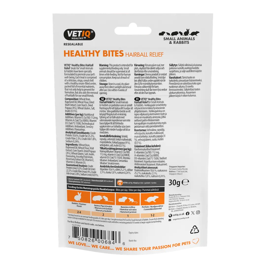 Say goodbye to pesky hairballs and hello to happier, healthier pets with VETIQ® Healthy Bites Hairball Relief! Specially crafted for small animals, these irresistible treats feature a crispy cereal shell with a luscious cream-filled center, ensuring every bite is as delicious as it is beneficial.