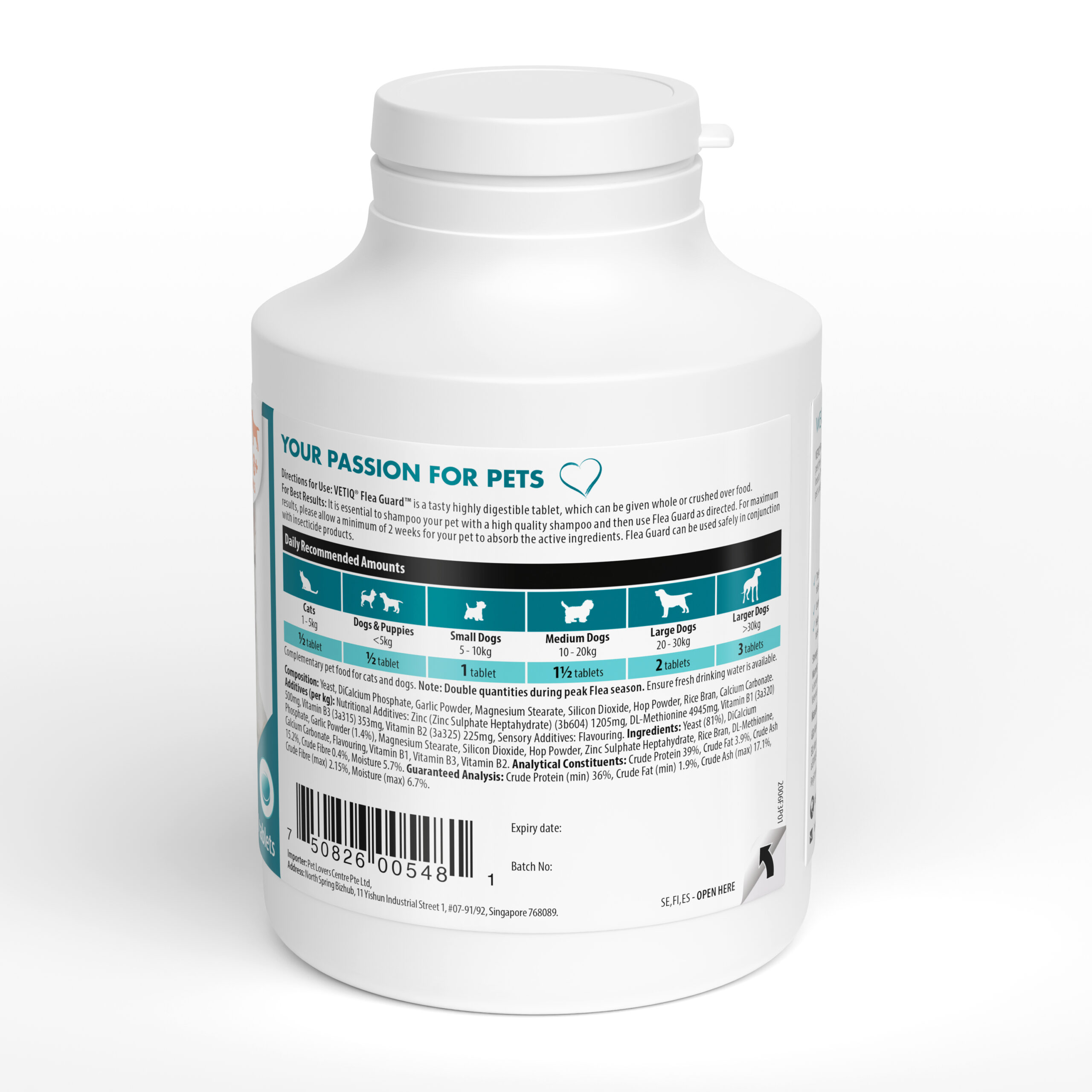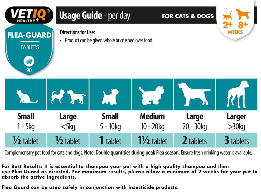 VETIQ® Flea Guard™ Tablets are a natural repellent for fleas, ticks & mosquitoes to keep your pet pest free. Easy & safe to use, it contains a blend of B vitamins, yeast, zinc and garlic to repel pesky insects. The formulation comes with the added benefit of reducing soggy pet smells and keeps your pet’s coat glossy and skin healthy.