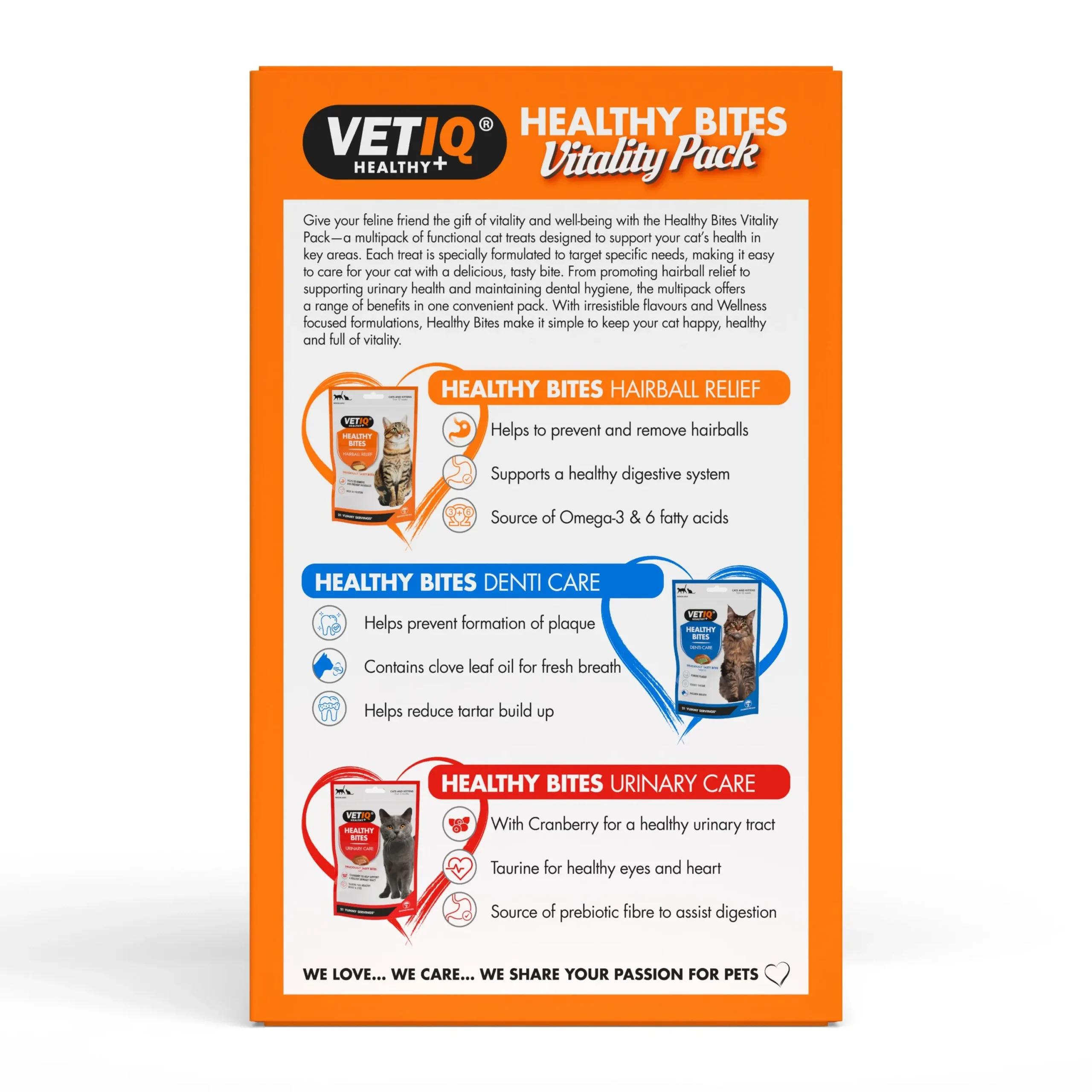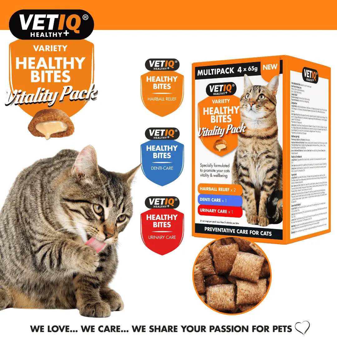 From promoting hairball relief to supporting urinary health and maintaining dental hygiene, the Vitality Pack offers a range of benefits in one convenient package. With irresistible flavours and wellness-focused formulas, Healthy Bites makes it simple to keep your cat happy, healthy, and full of vitality.