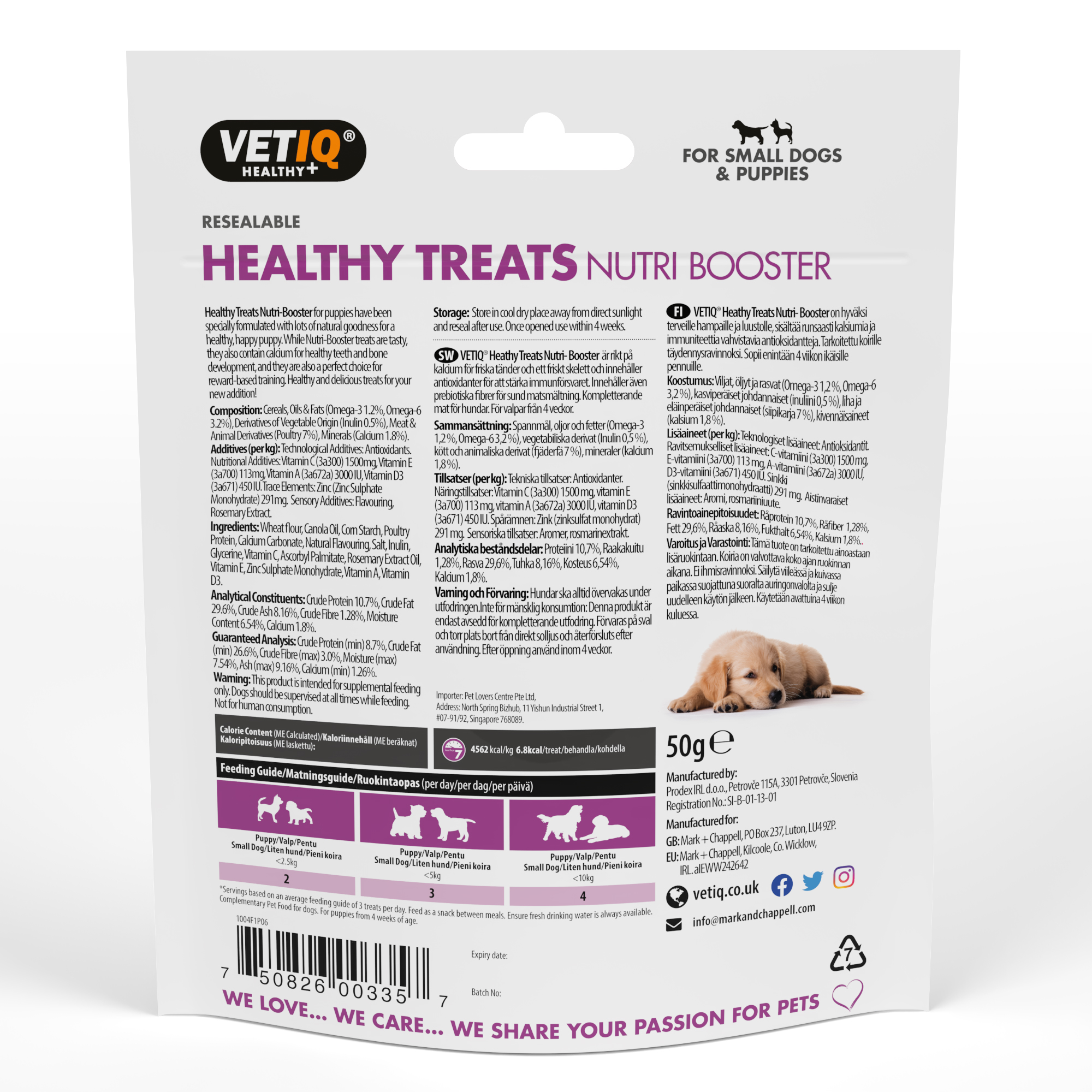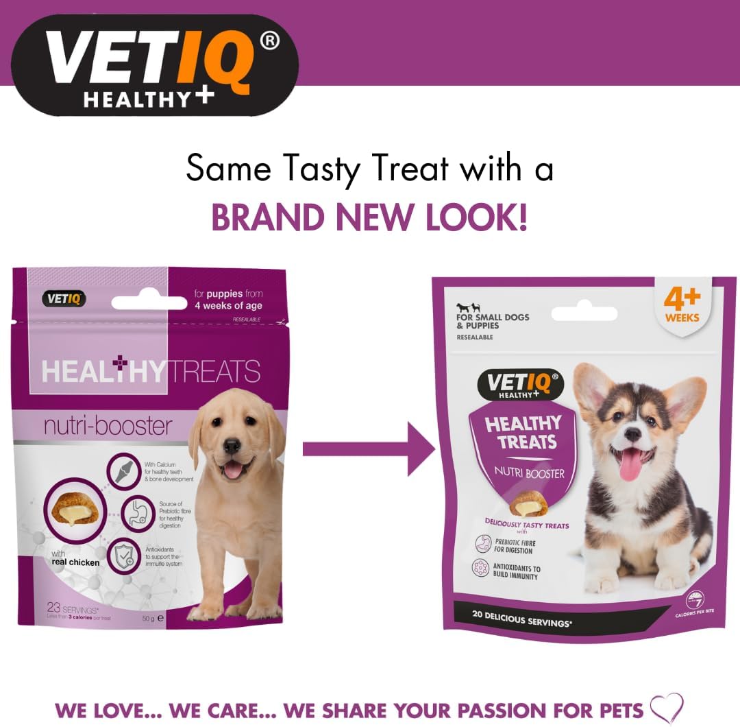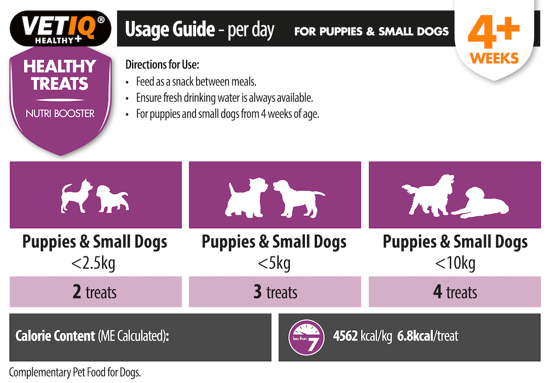 VETIQ® Healthy Treats Nutri Booster for puppies & small dogs have been specially formulated with lots of natural goodness for a healthy, happy pet. While Nutri Booster treats are tasty, they also contain calcium for healthy teeth and bone development, prebiotic fibre to aid digestion, omega fatty acids and are packed full of vitamins. They are also a perfect choice for reward-based training. Healthy and delicious treats for your new small canine addition! Total goodness!